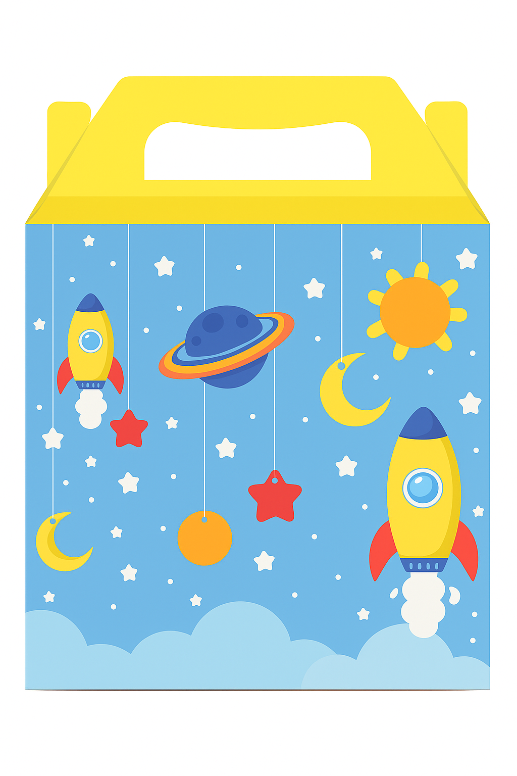 Com um design encantador inspirado no espaço sideral — repleto de foguetes, planetas, estrelas e luas — essa embalagem é perfeita para festas infantis temáticas, lembrancinhas, presentes e decorações criativas.
