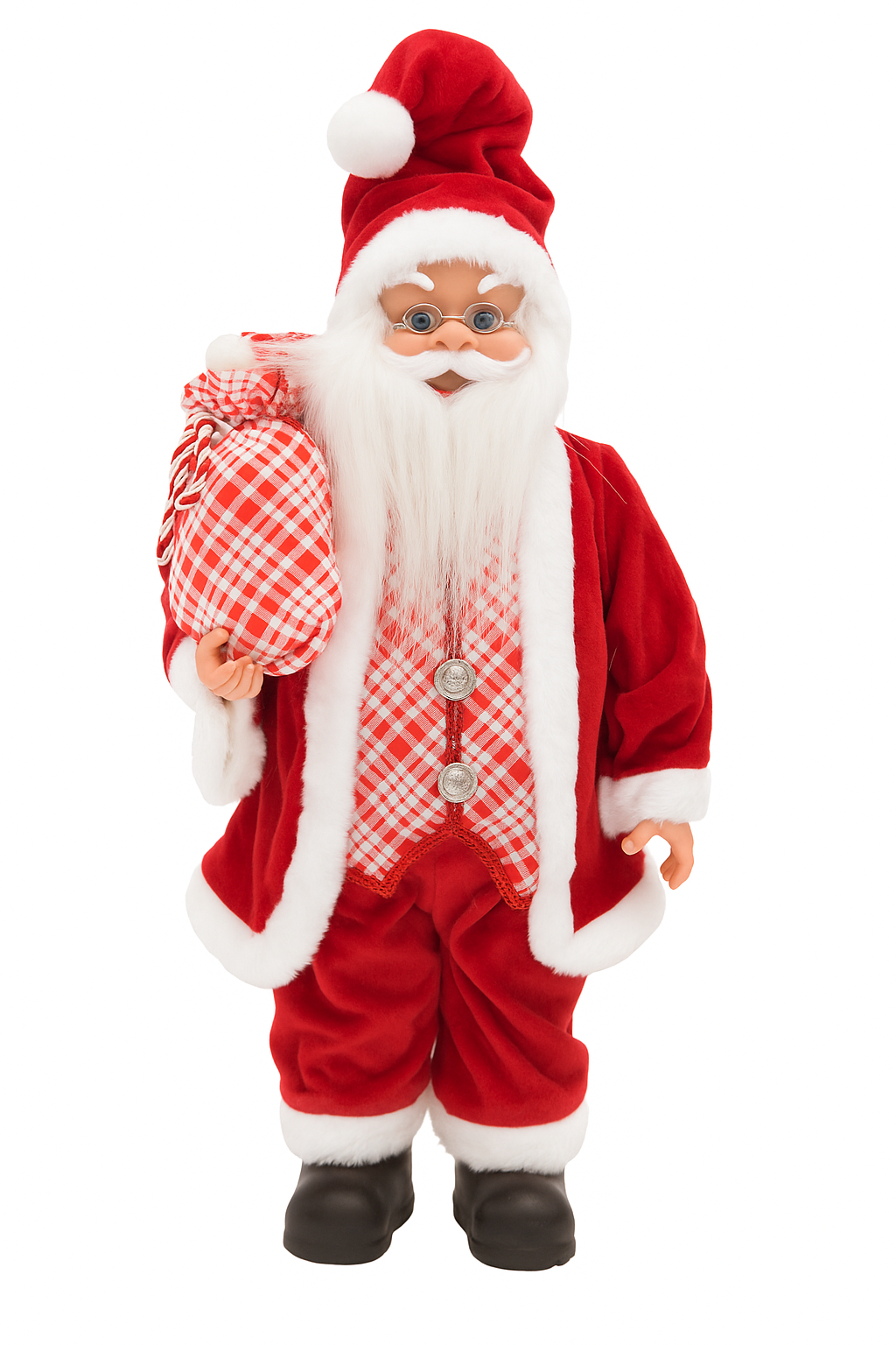 Seu rosto delicadamente esculpido, a barba macia e natural, e o saco de presentes com estampa xadrez completam o visual tradicional que encanta adultos e crianças.