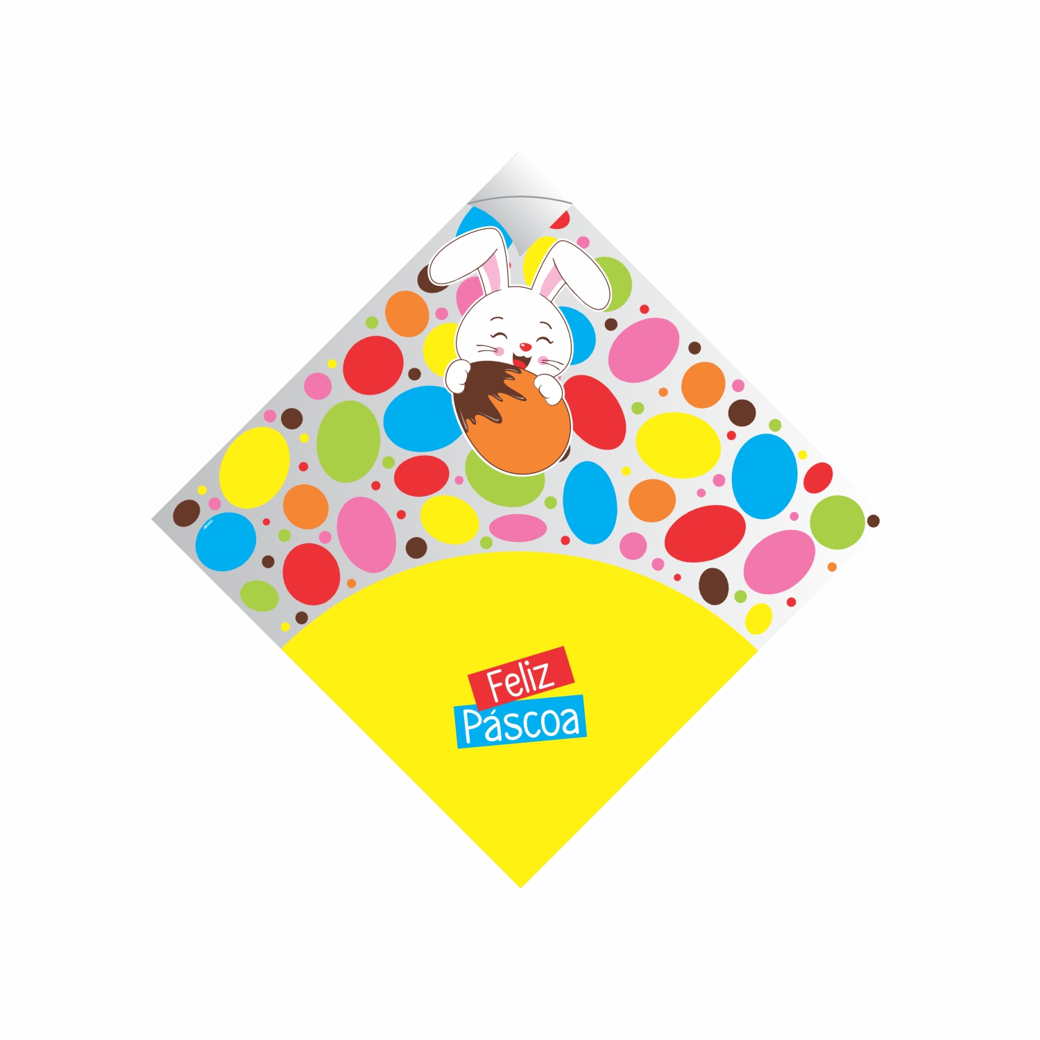 Com detalhe na cor amarela, ele transmite leveza, diversão e espírito pascal, destacando o produto sem esconder o chocolate.